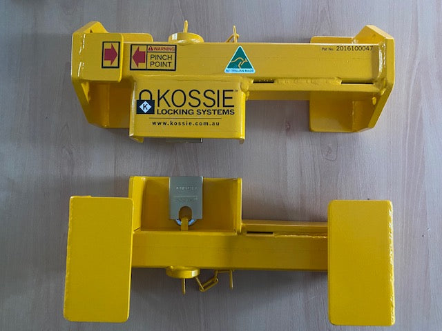 Our standard Kossie Container Lock spacing is 385mm from outside of bar to bar.